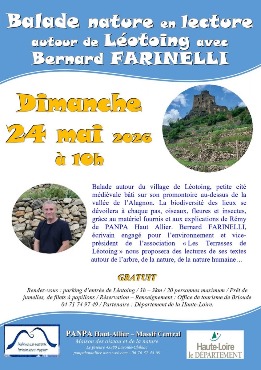 Balade autour du village de Léotoing, petite cité médiévale bâtie sur son promontoire au-dessus de la vallée de l'Alagnon. La biodiversité des lieux se dévoilera à chaque pas, oiseaux, fleurs et insectes, grâce au matériel fourni et aux explications de Rémy de PANPA Haut Allier. Bernard Farinelli, écrivain engagé pour l'environnement et vice-président de l'association « Les Terrasses de Léotoing » proposera des lectures de ses textes autour de l'arbre, de la nature, de la nature humaine.