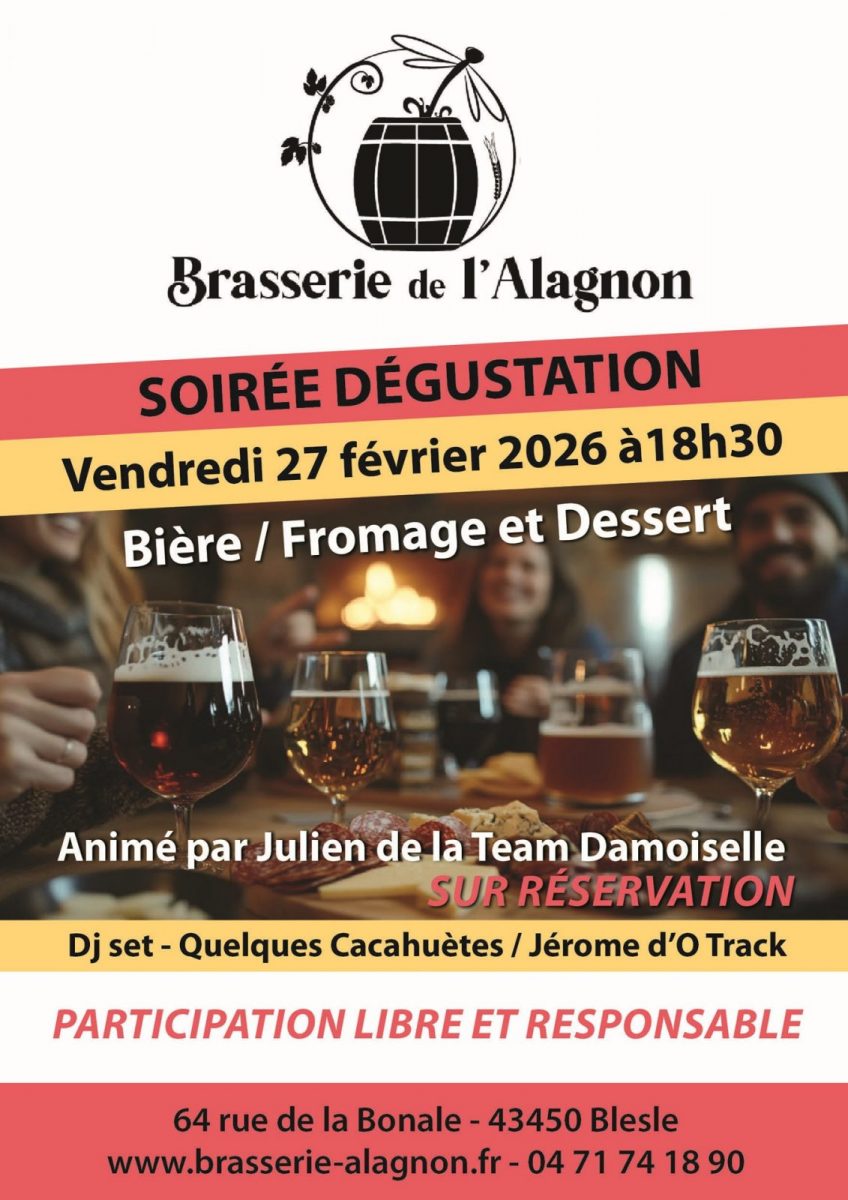 Animée par Julien de la Team Demoiselle, venez profiter d'une soirée dégustation bière, fromage et dessert à la Brasserie de l'Alagnon.