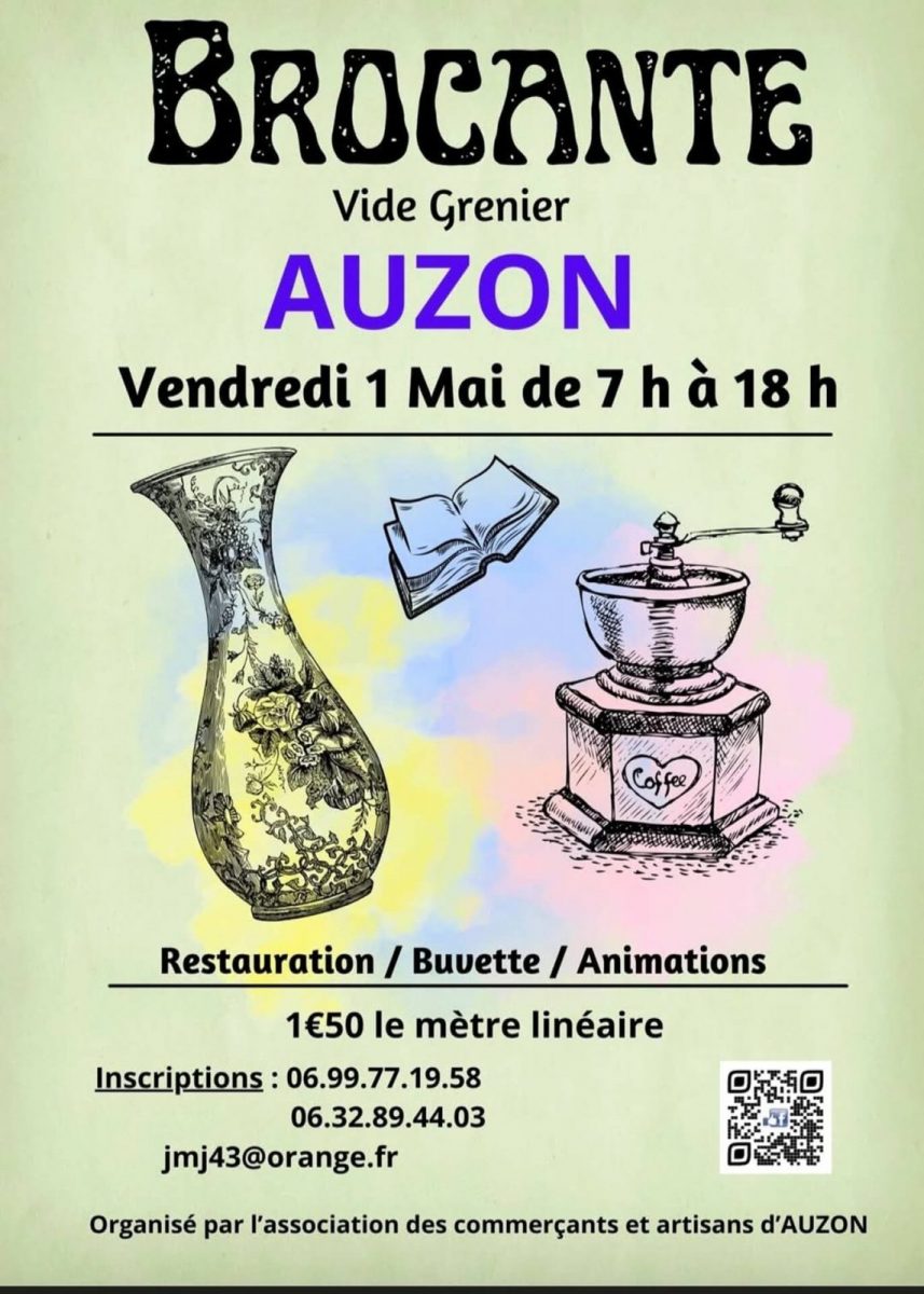 À propos Ouverture Prestations Informations de contact Retour à la liste Brocante et vide grenier à Auzon organisés par l'association des commerçants et artisans d'Auzon Buvette, restauration, animations Le tarif est de 1€50 le mètre linéaire. Ouverture Le 01 Mai Vendredi Ouvert de 07h à 18h Prestations Équipements Parking Parking à proximité Parking gratuit
