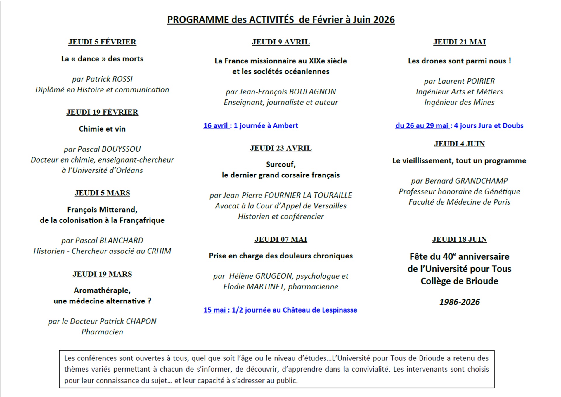 L'Université pour Tous de Brioude présente son programme de février à juin 2026 : 10 conférences sur des sujets variés (écologie, histoire locale, sciences...), le jeudi de 14h30 à 16h30, à la Halle aux Grains.
