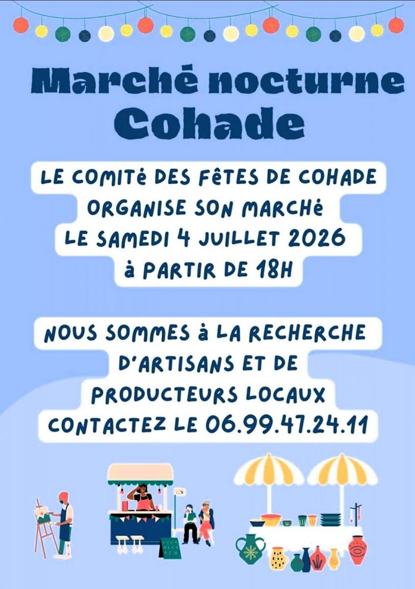 Le Comité des Fêtes de Cohade organise son marché nocturne le samedi 4 juillet 2026 à partir de 18h.