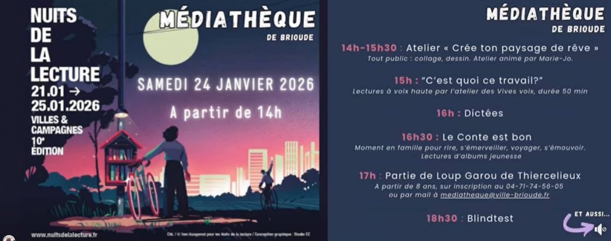 17h : Partie de Loup Garou de Thiercelieux, à partir de 8 ans, sur inscription au 04-71-74-56-05 ou par mail à mediatheque@ville-brioude.fr (animée par Marie-Jo).